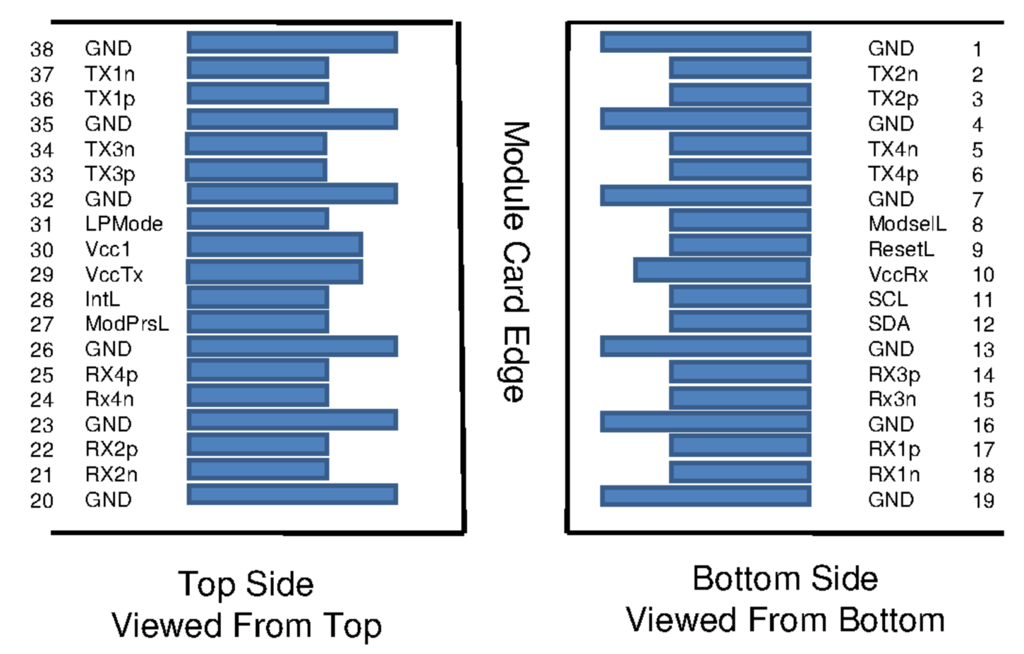 9: Rx(n)(p/n) are module receiver data outputs. Rx(n)(p/n) are AC-coupled 100 Ohm differential lines that should be terminated with 100 Ohm differentially at the Host ASIC(SerDes). The AC coupling is inside the module and not required on the Host board. For operation at 28 Gb/s the relevant standards (e.g., OIF CEI v3.1) define the signal requirements on the high-speed differential lines. For operation at lower rates, refer to the relevant standards.